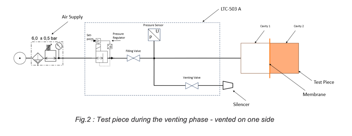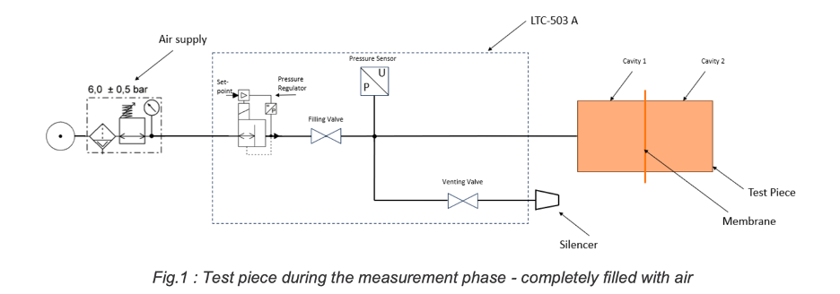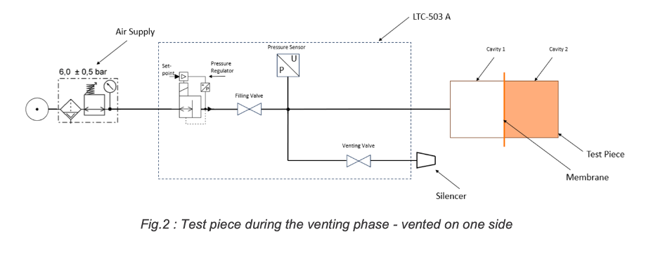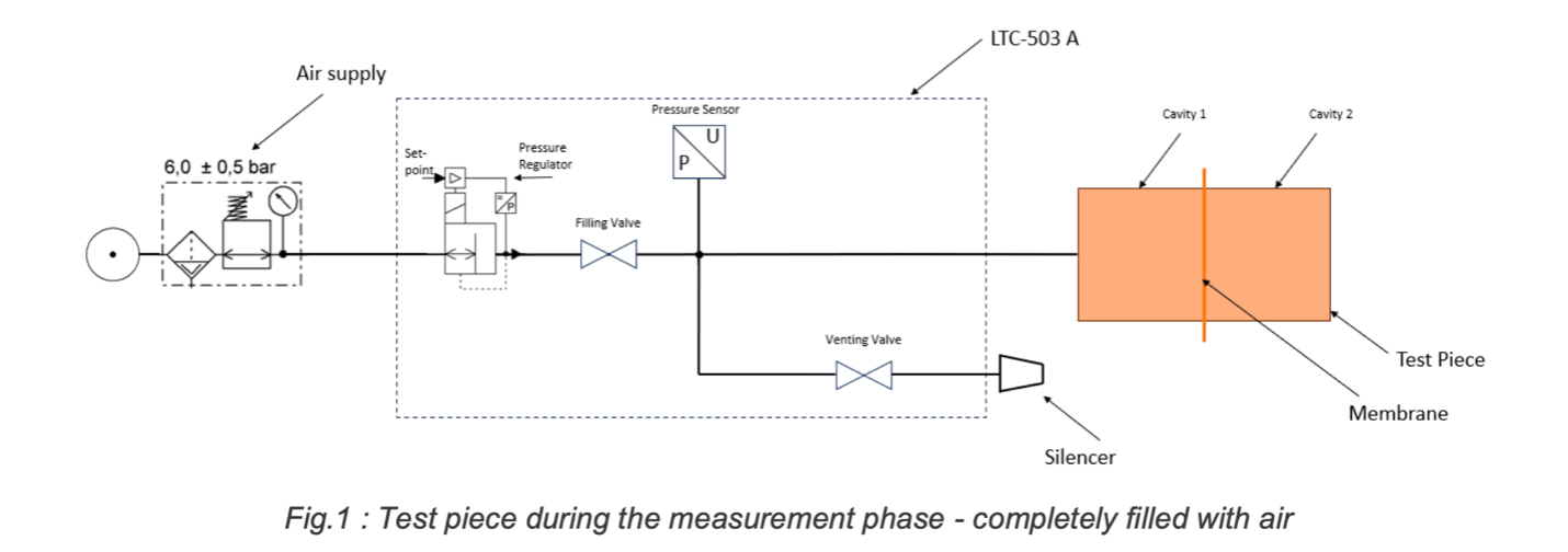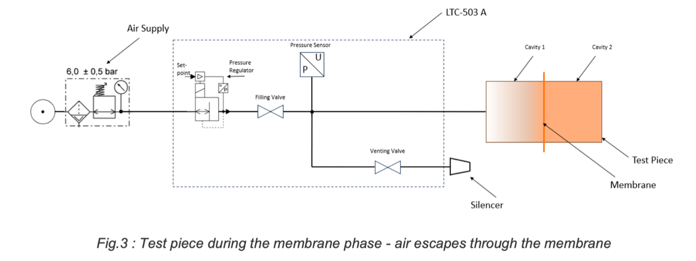 Aufgrund des Druckunterschieds zwischen den durch die Membran getrennten Hohlräumen strömt Luft durch die Membran, um den Druck auszugleichen. Dieser Vorgang verursacht eine Druckänderung in dem Hohlraum, der mit dem Drucksensor des LTC-503 verbunden ist. Der LTC-503 analysiert die Druckänderung und bewertet, ob die Funktion der Membran vorhanden/korrekt ist oder nicht.