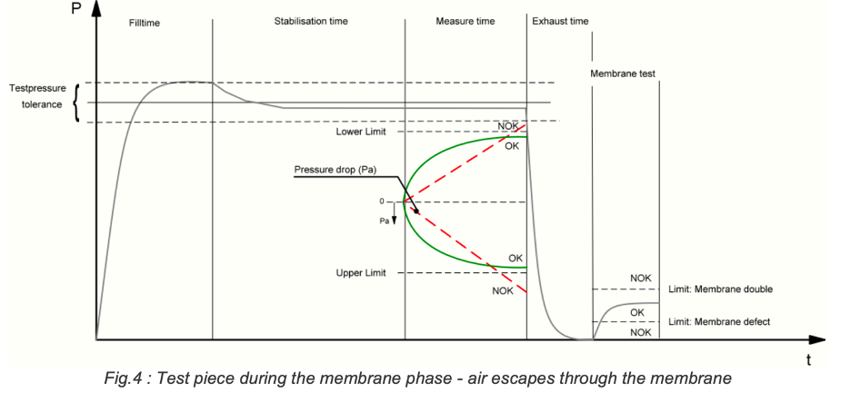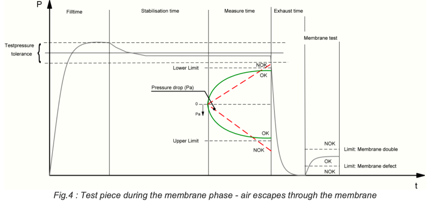 Für die Funktionsprüfung wird die Prüfprobe für eine bestimmte Zeit belüftet, dann beginnt die Messphase. In dieser Phase wird der Druckanstieg (oder -abfall bei der Prüfung auf Unterdruck) gemessen, der von einem Hohlraum in den anderen innerhalb des Teils fließt.